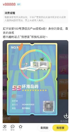 S级半海景房2200元,SS级环海岛屿88888元……在某二手交易平台,不少卖家开始以高价售卖“虹宇宙”房产。“身份的象征,尊贵的体现”,甚至有卖家以此描述虚拟房产的价值。