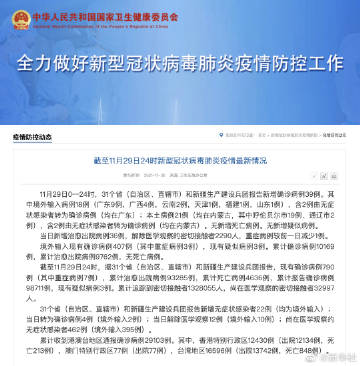 截至11月29日24时,据31个省(自治区、直辖市)和新疆生产建设兵团报告,现有确诊病例790例(其中重症病例7例),累计治愈出院病例93285例,累计死亡病例4636例,累计报告确诊病例98711例,现有疑似病例3例。累计追踪到密切接触者1328055人,尚在医学观察的密切接触者32997人。