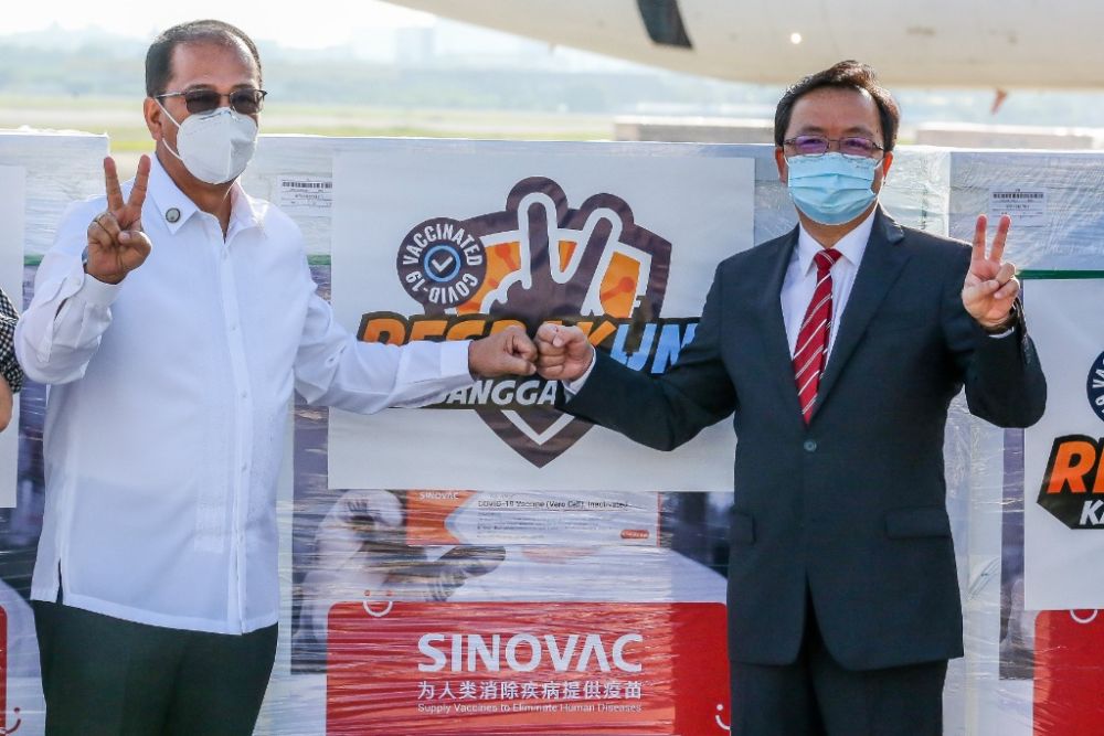 11月17日,在菲律宾马尼拉机场,中国驻菲律宾大使黄溪连(右)和菲政府应对新冠疫情总协调人卡利托·加尔韦斯在中国科兴新冠疫苗前合影。(新华社发,乌马利摄)