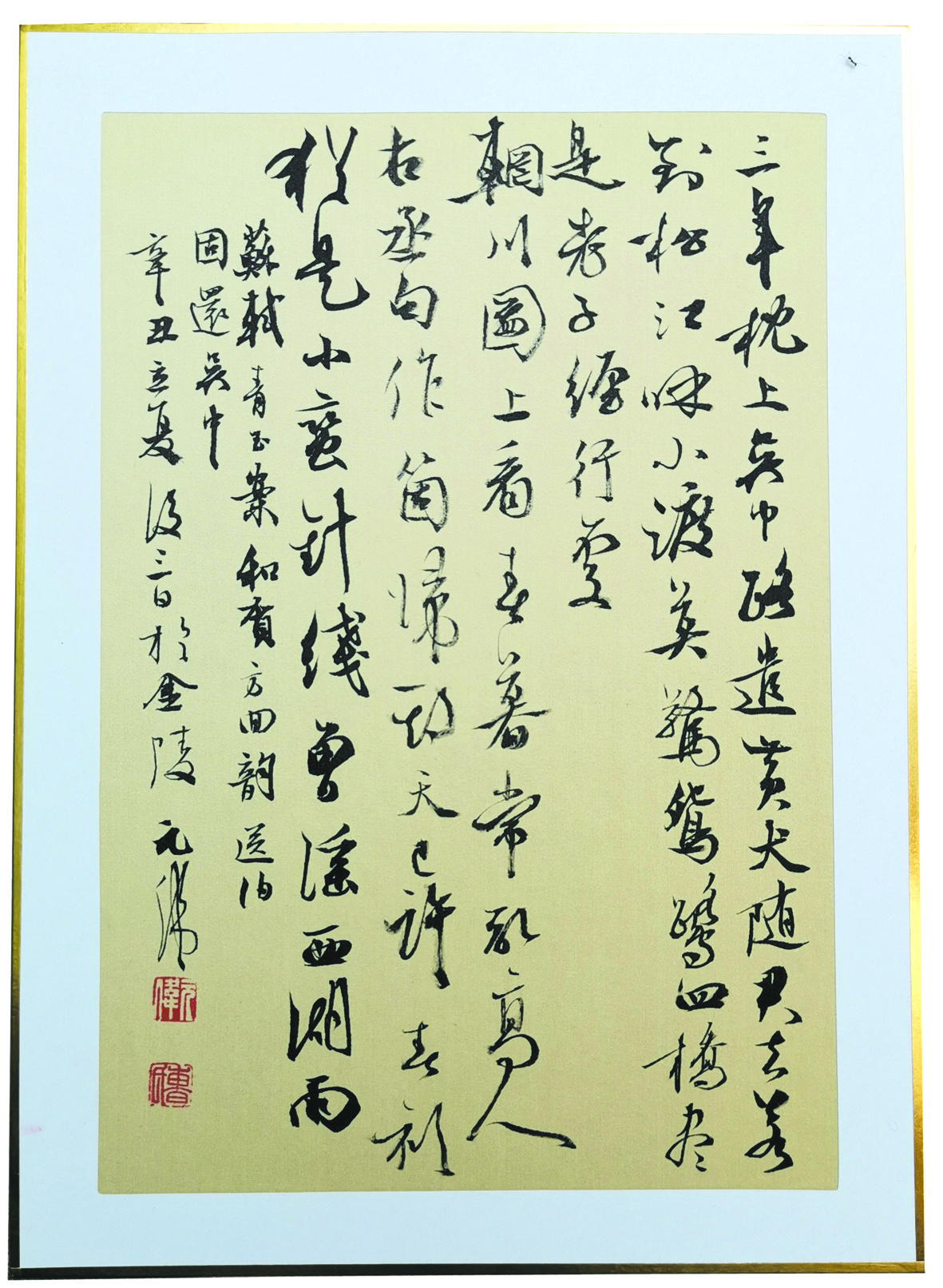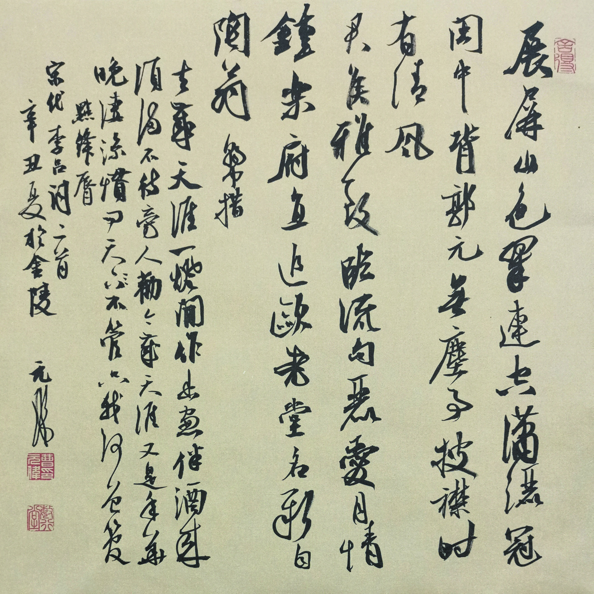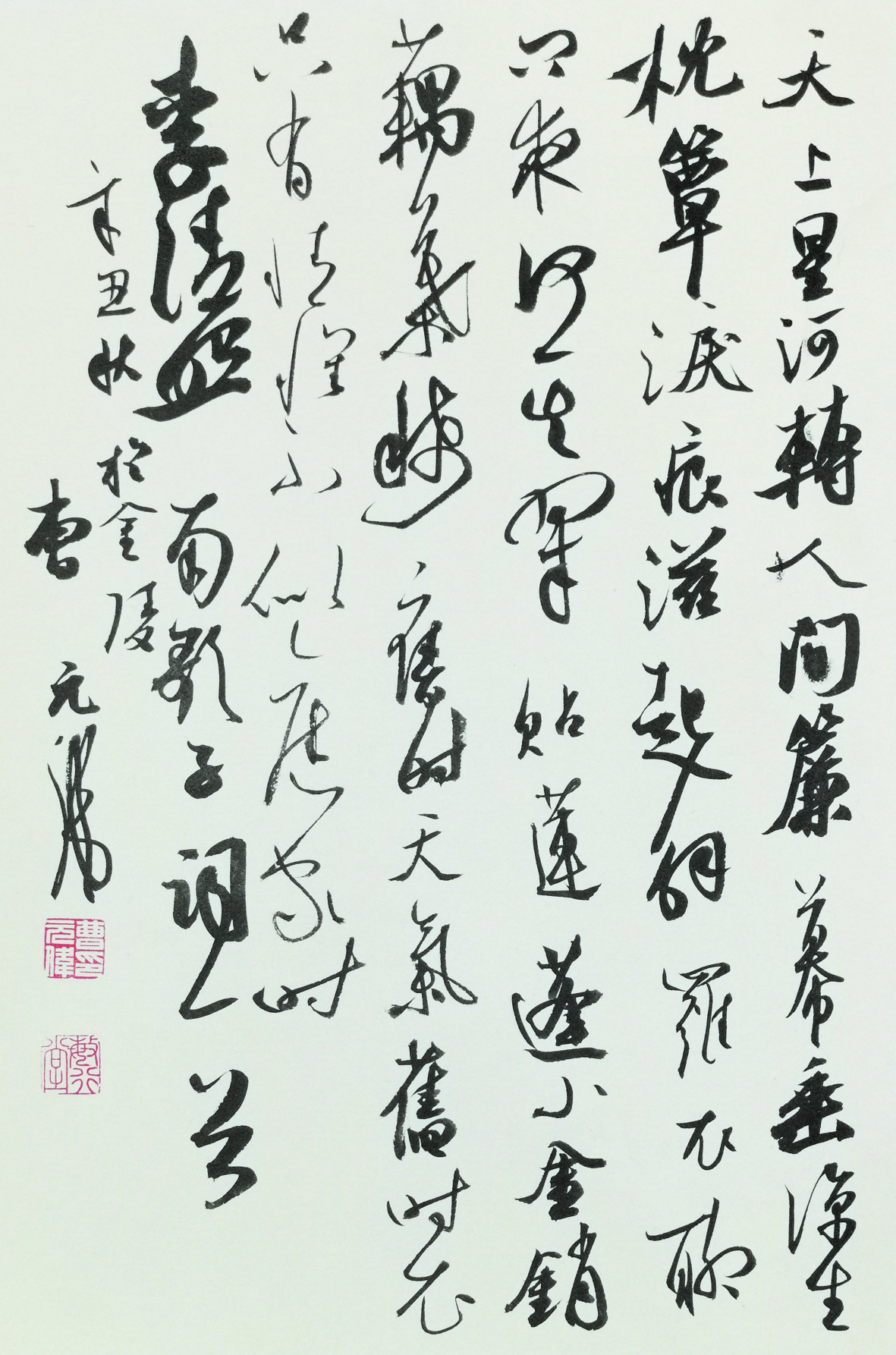 王国维以西方“崇高”美学的理论糅合中国古代美学阴阳刚柔说而提出:“美之为物有二种,一曰优美,一曰壮美。”元伟兄的书作,审美取向大多以优美为主,这或许是人在江苏,环境秀丽,心思精微的缘故吧。他的作品秀丽、妍雅、轻盈、宁静、飘逸、舒展、圆畅,给人以舒适自然、轻松愉悦和心旷神怡、赏心悦目之感。当然,元伟兄的作品不单单是优美一路,记得一次活动中,元伟兄创作了一丈二行草横幅,则以壮美为主,作品呈现出雄强、壮观、迅疾、奔放等特性,令人观之难忘,惊心动魄。