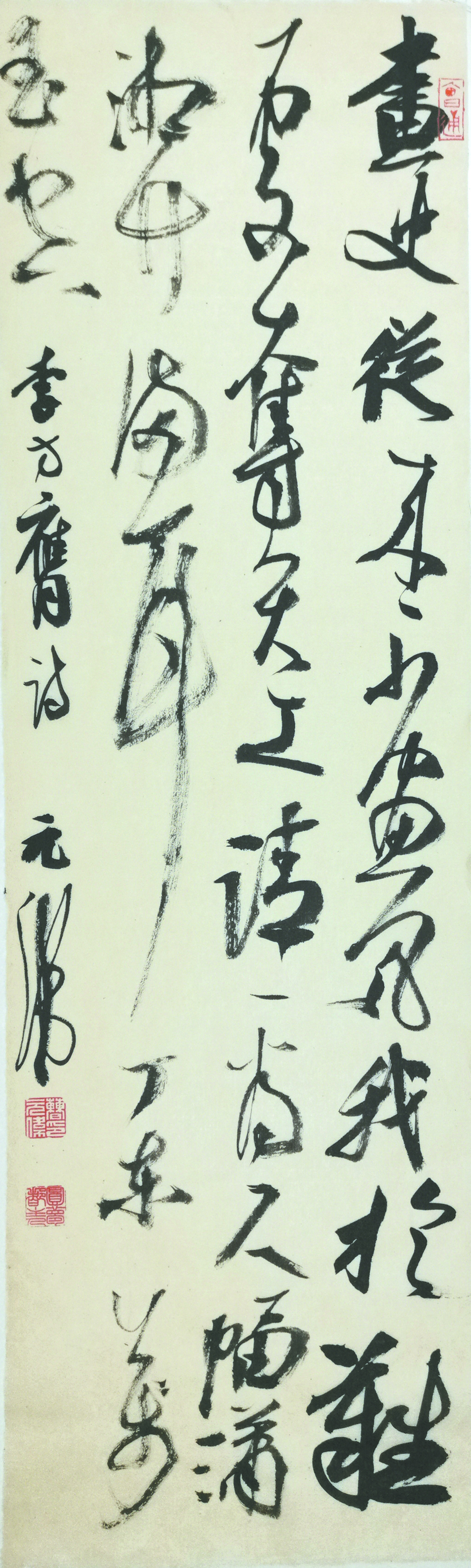 “承继是一生的功课,创变是终极的追求。”元伟说他“不喜欢抄书式的书写”,“每件作品均需表达自我的审美诉求”。显然,元伟对书法艺术创作的理念是深刻的!赏阅他的行草作品,不管是宏幅巨幛,还是尺牍手卷,读者可以感觉到书家一任胸臆之豪情,更见笔底之波澜。朴茂恣肆,雄浑宏阔是元伟书法的总体风格。其用笔劲疾铦利,骨力充盈,开合得度,虚实相兼;布白弛张谨严,恢廓流变;墨态浓渴活用,意蕴冲和。元伟行草书作品中所透析的充沛的大气与高迈的风神,不但彰显了书家个性的审美理想,也在一定意义上融合了时代脉象的律动。
