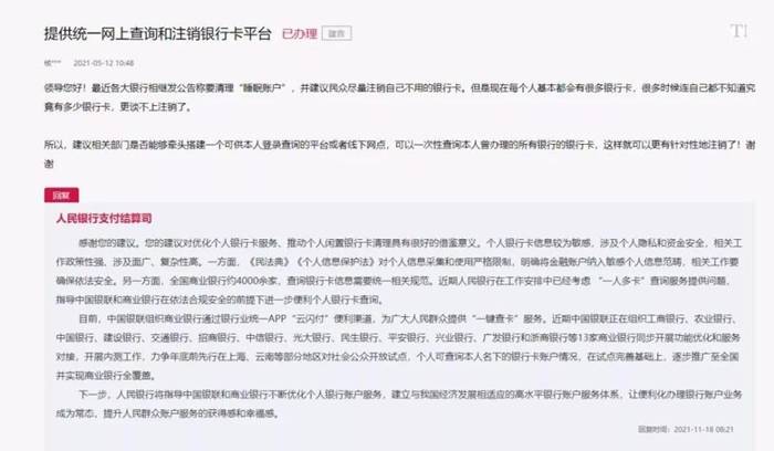 人民银行表示,个人银行卡信息较为敏感,涉及个人隐私和资金安全,相关工作政策性强、涉及面广、复杂性高。一方面,《民法典》《个人信息保护法》对个人信息采集和使用严格限制,明确将金融账户纳入敏感个人信息范畴,相关工作要确保依法安全。另一方面,全国商业银行约4000余家,查询银行卡信息需要统一相关规范。近期在工作安排中已经考虑“一人多卡”查询服务提供问题,指导中国银联和商业银行在依法合规安全的前提下进一步便利个人银行卡查询。
