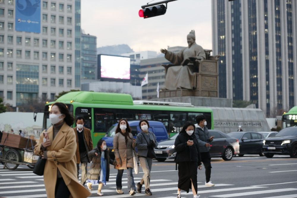11月29日,行人佩戴口罩在韩国首尔光化门广场过马路。(新华社记者王益亮摄)