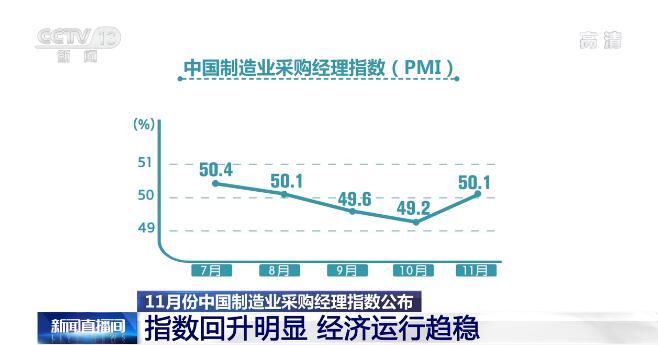11月份,中国制造业采购经理指数为50.1%,较上月回升0.9个百分点。各分项指数和行业指数普遍回升,并且回升幅度较为明显,显示经济运行中呈现积极变化。