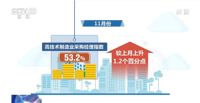 具体来看,21个细分行业中有15个行业的采购经理指数较上月上升,显示制造业回升较为全面,产业链供应链协同恢复较好。其中,11月份高技术制造业采购经理指数为53.2%,较上月上升1.2个百分点。