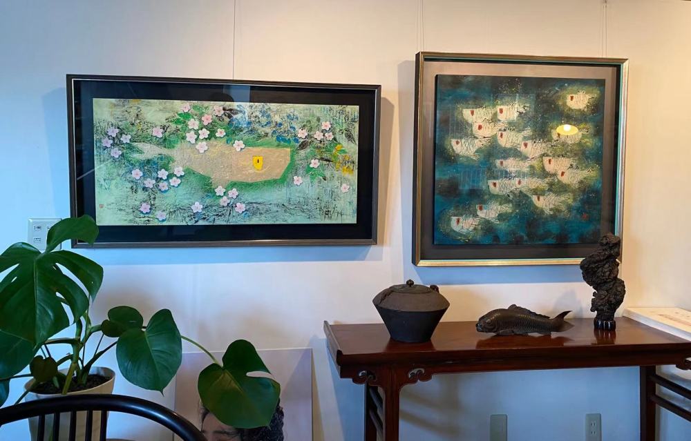 王传峰告诉记者,自己和鱼有着不解之缘。他从小就喜欢家里过年贴的窗花和年画上的鱼。年轻时去杭州中国美院学习,喜欢去西湖看水里自由自在的鱼。出国后,发现鱼在日本文化中也随处可见。于是他抓住鱼这个符号,从绘画手法、创作材料、思想表达上尝试将中日文化融为一体并不断创新。