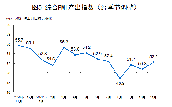 数据显示,11月份,综合PMI产出指数为52.2%,比上月上升1.4个百分点。
