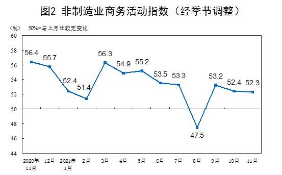 数据显示,11月份,非制造业商务活动指数为52.3%,比上月略降0.1个百分点,继续高于临界点,非制造业总体保持稳定恢复。