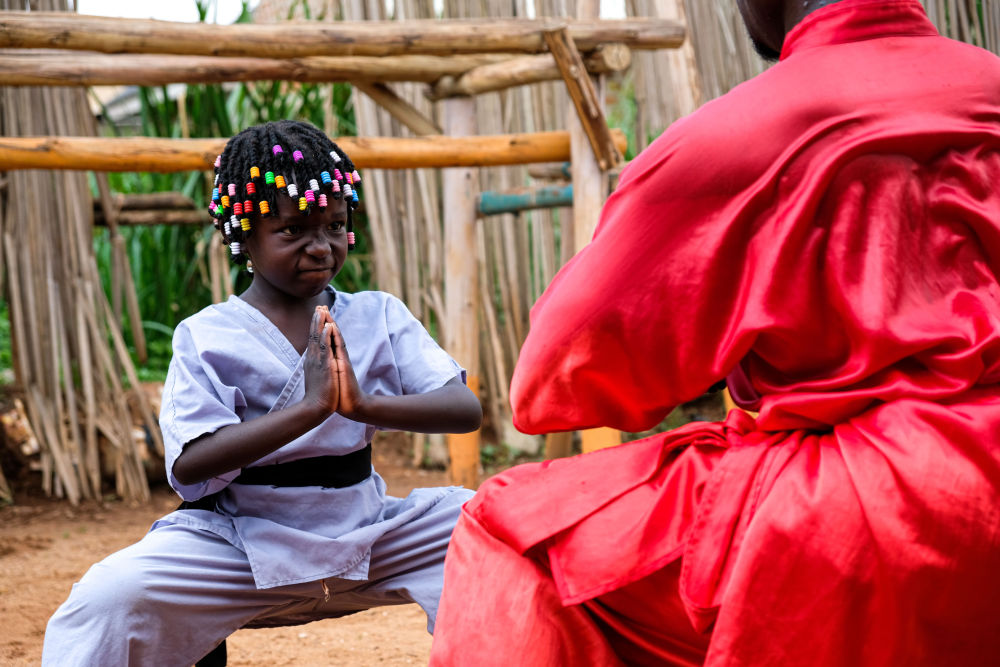 2021年8月23日,在乌干达瓦基索区的卡图克镇,武术教练基扎·玛尼苏鲁·塞吉姆巴正在教他的五岁女儿中国功夫。新华社发
