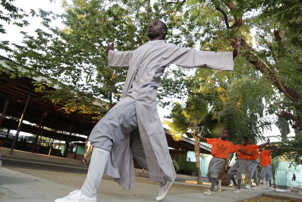 2021年9月7日,在坦桑尼亚最大城市达累斯萨拉姆,赛义迪·姆福米带领弟子们练习中国功夫。新华社发(赫曼·伊曼努尔 摄)