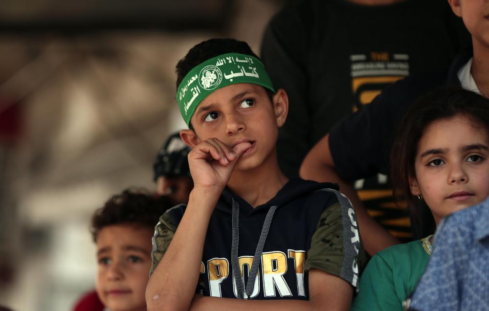 5月21日,巴勒斯坦儿童在加沙地带城市汗尤尼斯参加集会,庆祝伊斯兰抵抗运动(哈马斯)与以色列达成停火协议。 (新华社发,亚西尔摄)