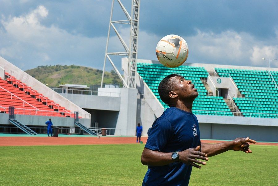 11月18日,在喀麦隆西部大区巴富萨姆市郊的巴富萨姆体育场,当地俱乐部球员瑞安特·谭宇进行训练。(新华社发,科普索摄)