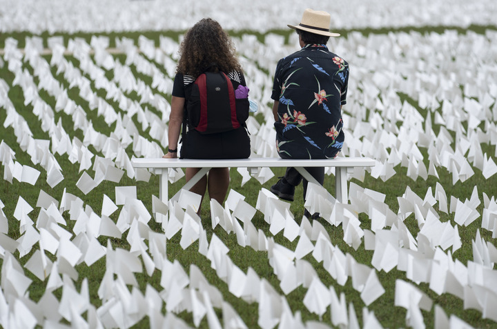 2021年9月17日,在美国首都华盛顿的华盛顿纪念碑附近的草坪上,参观者坐在白色旗帜中间,悼念美国超过66万名新冠逝者。新华社记者 刘杰 摄