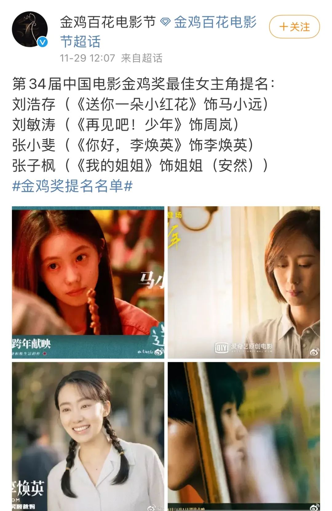 11月29日中午12点零1分,“金鸡百花电影节”官方微博在发布主视觉之后,正式公布第34届中国电影“金鸡奖”提名名单。