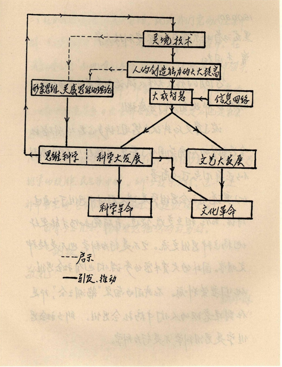 1994年10月,钱学森给戴汝为、汪成为、钱学敏三人写信说,“灵境技术是继计算机技术革命之后的又一项技术革命。它将引发一系列震撼全世界的变革,一定是人类历史中的大事。”在信中,他亲手绘制了一张导图,以阐释“灵境”技术的广泛应用可能会引发人类社会的全方位变革。