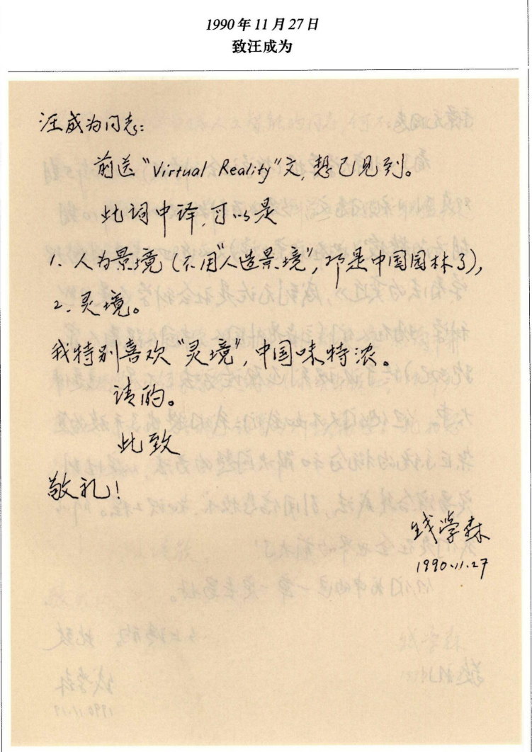 1990年11月27日,钱学森给时任国家863计划智能计算机专家组组长、同时也是自己的弟子汪成为写了一封信,表示自己将“Virtual Reality”(虚拟现实技术)一词翻译成“灵境”。1998年6月,87岁的钱学森还写了一篇短文《用“灵境”是实事求是的》:“我们传统文化正好有一个表达这种情况的词:‘灵境’;这比‘临境’好,因为这个境是虚的,不是实的。”