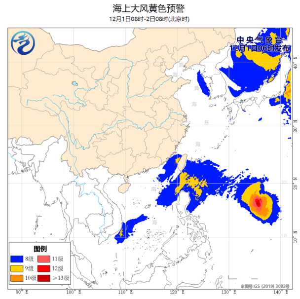 此外,中央气象台今晨继续发布海上大风黄色预警:预计,受冷空气影响,1日白天至夜间,黄海东部部分海域、台湾海峡、台湾以东洋面、巴士海峡、南海东北部和中东部海域、南海西南部的部分海域将有8~9级、阵风10~11级的大风。