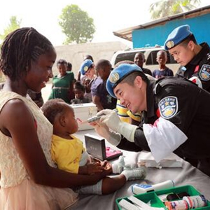 2017年12月28日,在利比里亚蒙罗维亚,中国第五支驻利比里亚维和警察防暴队医护人员为本森威尔社区孤儿院的儿童和员工进行义诊。新华社发(赵小新摄)
