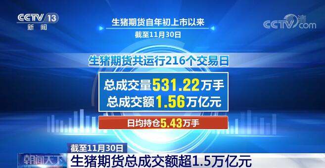 央视网消息:来自大连商品交易所的最新数据显示,生猪期货自年初上市以来,截至昨天(11月30日),生猪期货共运行216个交易日,总成交量531.22万手,总成交额1.56万亿元,日均持仓5.43万手。