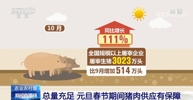 辛国昌介绍说,今年6月、7月出生的仔猪数量同比分别增加39%、33%,而这两个月出生的仔猪出栏上市时间正值元旦、春节期间,可以保障两节期间猪肉市场供应。