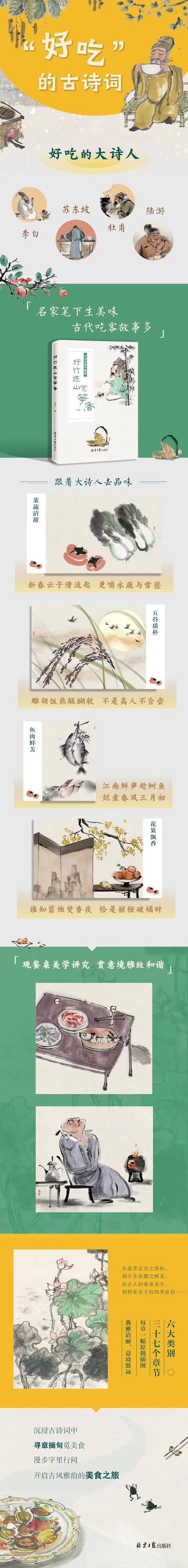 中国古代爱吃、会吃的大诗人可不少,“万人迷”苏东坡,仙气飘飘的李白……诗词与美食都有着许多难以言表的意趣。在博大精深的中国文化中,“饮食文化”是如此不可忽略、如此引人入胜的一部分。“长江绕郭知鱼美,好竹连山觉笋香。”2021年12月1日,《好竹连山觉笋香:古诗词里寻美食》由北京日报出版社出版。该书在古诗词中寻章摘句觅美食,在诗词歌赋中体味烟火人间,更是寻觅古人意趣、情味的有趣旅程。