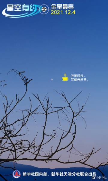 【定好闹钟 #4日傍晚看夜空中最亮的星#】通常情况下,金星是除太阳和月亮以外全天最亮的天体,亮度最大时可达-4.9等。12月4日,金星将迎来亮度最大时刻,傍晚时分在西南方低空中大放异彩。如果天气晴好,请定好你的闹钟,去观赏一下这颗“夜空中最亮的星”。(记者周润健,海报制作:冯娟)