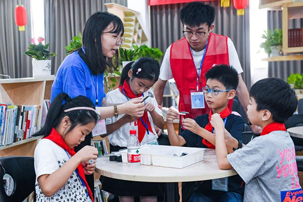 图为小学生们在志愿者的指导下学习创意积木搭建