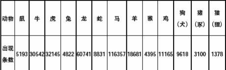 有人在古籍里搜索了十二生肖的名字,还搜了下猫(含狸),结果可称惨淡。