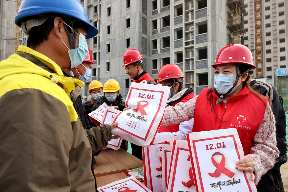 11月30日,山东省枣庄市市中区光明路街道工作人员在当地一处建筑工地发放“防艾”宣传资料。新华社发(孙中喆 摄)