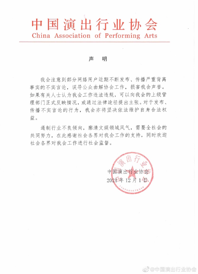今日中演协发布《声明》:我会注意到部分网络用户近期不断发布、传播严重背离事实的不实言论,误导公众曲解协会工作,损害我会声誉。如果有关人士认为我会工作违法违规,可以向我会的上级管理部门正式反映情况,或通过法律途径提出主张。对于发布、传播不实言论的行为,我会亦将坚决依法维护自身合法权益。遏制行业不良倾向,廓清文娱领域风气,需要全社会的共同努力,在此感谢社会各界对我会工作的支持,同时欢迎社会各界对我会工作进行社会监督。