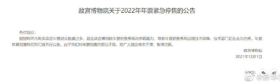 【#故宫年票紧急停售#】故宫博物院12月1日发布公告称,因短时间内购买故宫年票观众数量过多,超出故宫博物院年票销售系统的承载能力,导致年票销售系统出现技术故障,技术部门正在全力抢修。年票恢复销售时间将另行公告。(记者施雨岑)