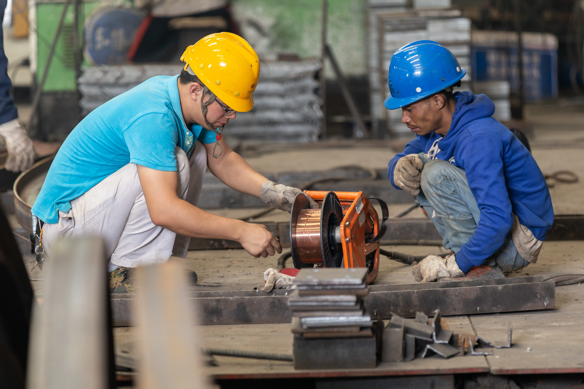 2019年11月7日,在老挝琅勃拉邦,中国技术人员(左)在钢筋加工厂教老挝工人检修设备。