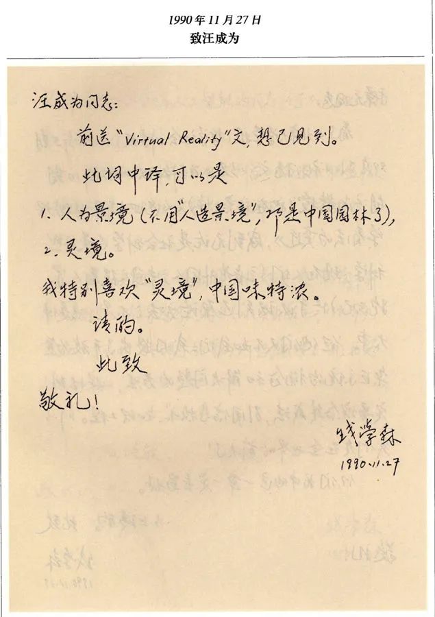 1990年,钱学森给时任“863计划”智能计算机专家组组长的汪成为写了一封信,给Virtual Reality提供了两个翻译——“人为景境”或“灵境”。钱学森说自己喜欢后者,因为中国味特浓。这一讨论的原点是钱学森对于人工智能问题的思考。