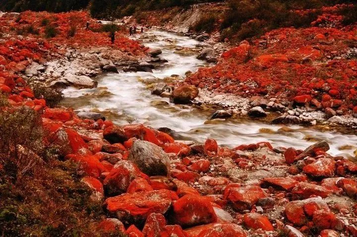 你见过红色的石头吗?在四川海螺沟景区,就有这样的红色石头,特别艳丽。