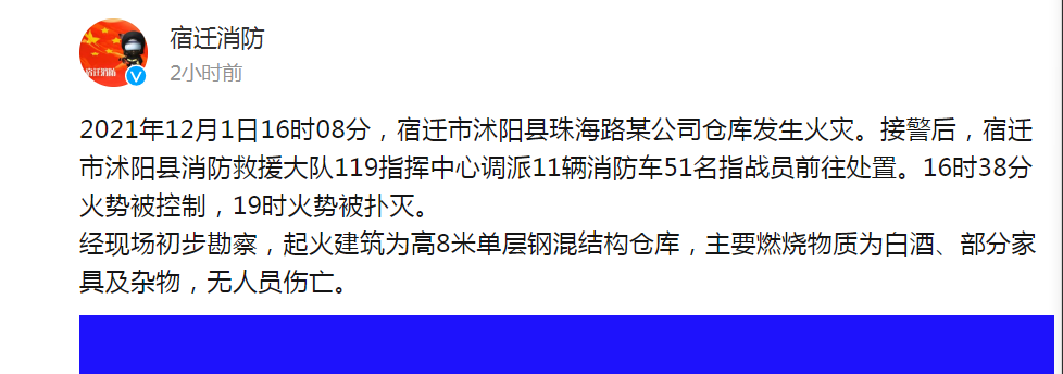 记者从江苏宿迁消防部门了解到,1日16时08分,宿迁市沭阳县珠海路某公司仓库发生火灾,当地调派11辆消防车51名指战员前往处置。16时38分火势被控制,19时火势被扑灭。