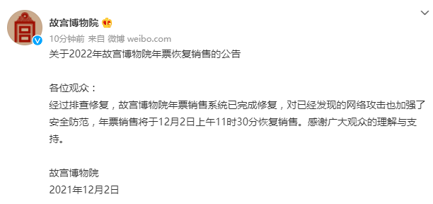 新京报快讯 据故宫博物院官方微博消息,经过排查修复,故宫博物院年票销售系统已完成修复,对已经发现的网络攻击也加强了安全防范,年票销售将于12月2日上午11时30分恢复销售。感谢广大观众的理解与支持。