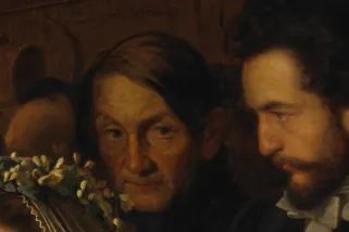 他双手抱胸、表情严肃,用审视、严峻谴责的目光注视这幕人间丑剧。据说这个年轻的男子正是根据画家自身的原型所作。画家也有类似的经历,他的未婚妻就是因为种种原因被家人许配给这样的一个老人。