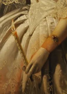 女孩——作为情妇而非合法妻子,她是感情的掠夺者,也是公爵的猎物,那包裹头部的薄纱和丝带、头盔似的发型、缠绕脖子的珠链都是束缚。
