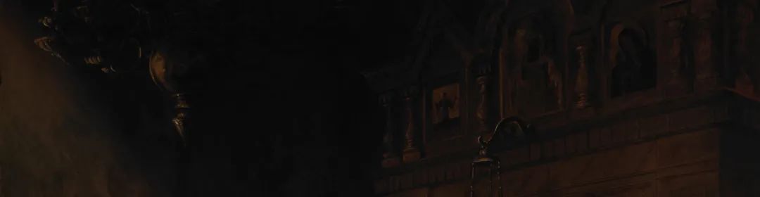 她的婚纱是上好的轻纱所制,上面有着细碎的光芒。但是这么美丽又怎么样呢?她的左手甚至不想好好地拿蜡烛,右手机械地伸着让神父戴戒指。她即使心里万般不愿又能怎么样呢?身为社会的最底层,又不得不向命运屈服。主持婚礼的神父虽然也是衣着华贵,堆锦列绣,金碧辉煌。但是整个人也是苍老不堪,佝偻着腰逆着光,在阴暗中仿佛是一个鬼魅。