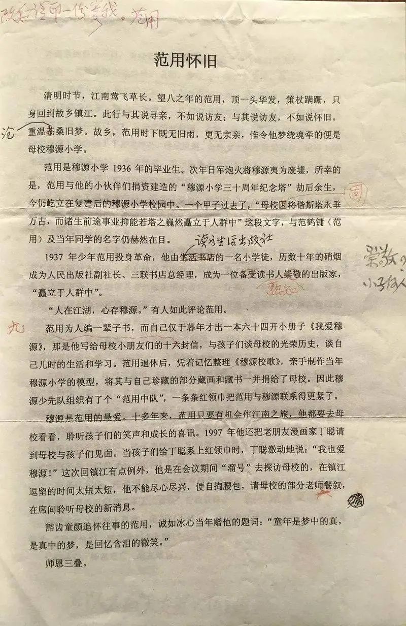 1997年,范用到南京拜访陈白尘夫人金玲女士,我全程陪同。范公对前贤的尊崇,对其未亡人的关爱,令我感动,遂写了篇《范用怀旧》,稿毕寄范公审读。