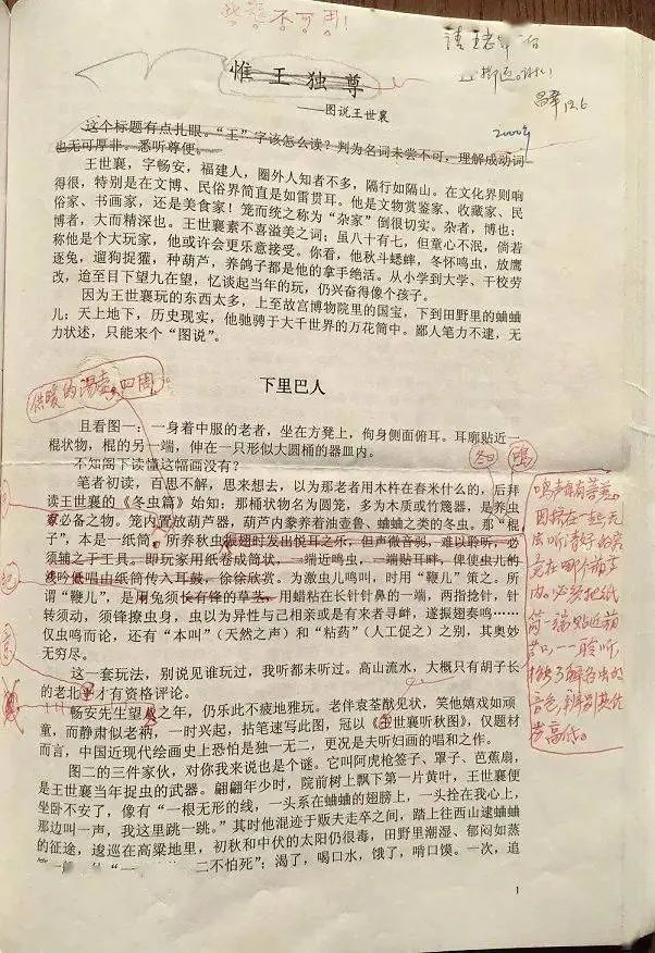 因先生涉猎的一些领域,我的知识盲点太多,笔力不逮,便偷懒走捷径,简化为“图说”,冠题《唯王独尊——图说王世襄》,先生读后将稿退我,我浏览后,感愧交并。愧的是太粗疏,令我无地自容的是竟将先生老师的大名“刘盼遂”写成“刘盼递”,实在大不恭。先生只作更正,未作批评。令我感动的是,他改得特别认真,“听虫”一小段竟然重写。