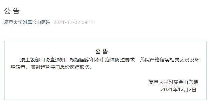 12月2日,复旦大学附属金山医院发布公告:接上级部门协查通知,根据国家和本市疫情防控要求,我院严格落实相关人员及环境筛查,即刻起暂停门急诊医疗服务。
