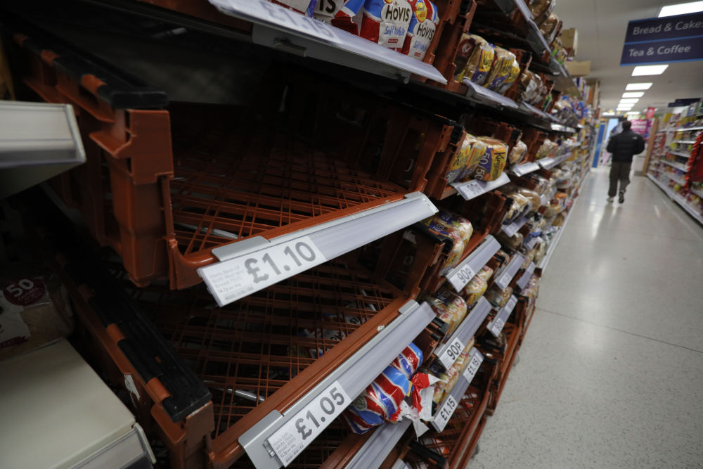 ↓这是11月24日在英国伦敦一家超市拍摄的缺货的面包货架。