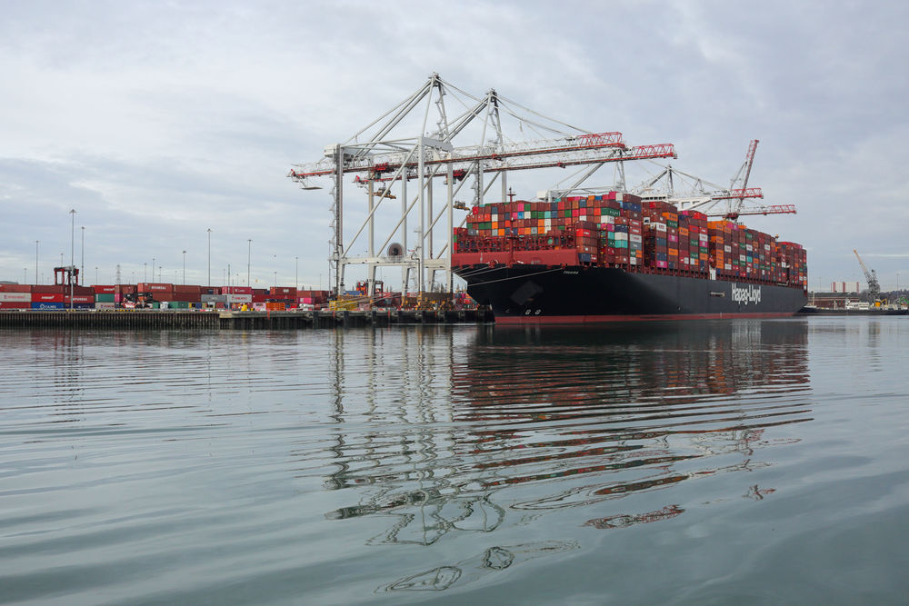 ↓这是11月29日在英国南安普敦港口拍摄的集装箱和货船。