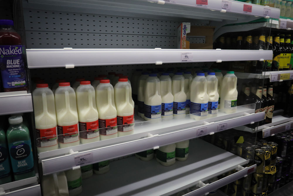 ↓这是11月24日在英国伦敦一家超市拍摄的缺货的牛奶和豆奶货架。