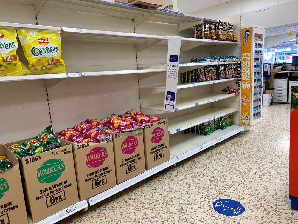 ↓这是11月29日在英国贝辛斯托克一家超市拍摄的缺货的食品货架。