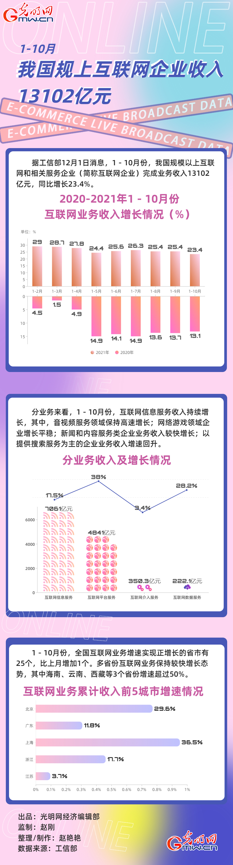 光明网讯(记者 赵艳艳)据工信部12月1日消息,1-10月份,我国规模以上互联网和相关服务企业(简称互联网企业)完成业务收入13102亿元,同比增长23.4%,增速较前三季度回落2个百分点,两年平均增速为18.1%。