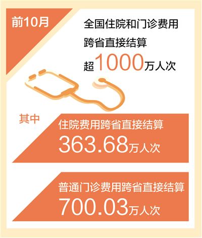 数据显示,前10月,全国住院和门诊费用跨省直接结算超1000万人次,其中,住院费用跨省直接结算363.68万人次,涉及医疗费用880.35亿元,基金支付510.34亿元,基金支付比例为58.0%;普通门诊费用跨省直接结算700.03万人次,涉及医疗费用17.52亿元,基金支付9.62亿元,基金支付比例为54.9%。