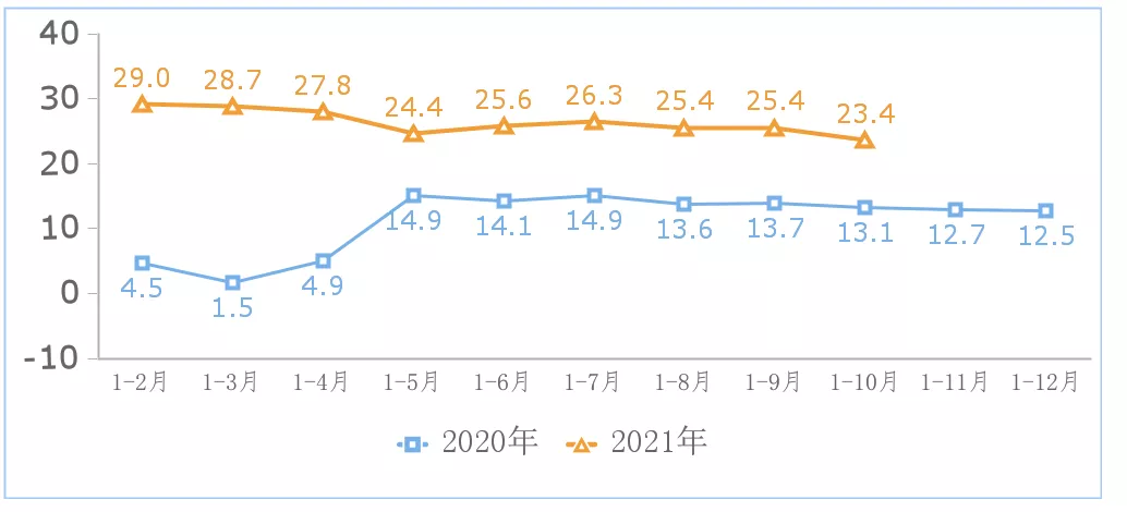 图12020-2021年1-10月份互联网业务收入增长情况(%)