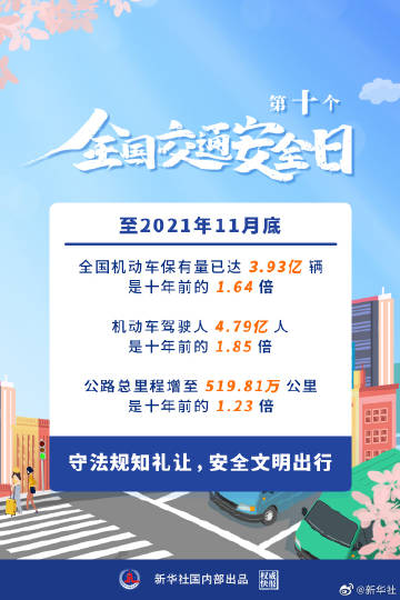 【#权威快报#|第十个“全国交通安全日”来了!】2021年12月2日是第十个“全国交通安全日”,主题是“守法规知礼让,安全文明出行”。截至今年11月底,全国机动车保有量已达3.93亿辆,是十年前的1.64倍;机动车驾驶人4.79亿人,是十年前的1.85倍。在机动车保有量和驾驶人数量双双“井喷式增长”、交通压力持续增大的背景下,#我国道路交通事故万车死亡人数总体下降#。交通安全,从每一个交通参与者的足下文明开始。(记者任沁沁、熊丰,海报设计杨逸群)